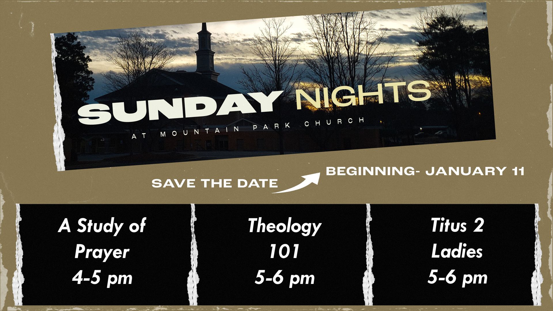 Join us at Mountain Park Church on Sunday Nights for a time of study and prayer.